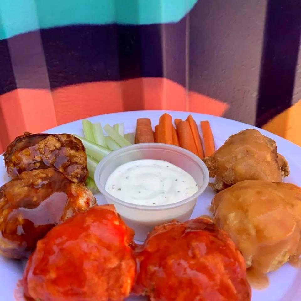 ¡Todo con menos grasa! 300 g de pechuga de pollo en freidora de aire, crujiente por fuera y jugosa por dentro. Con trocitos de apio y zanahoria, más una porción de aderezo ranch. Y tú eliges hasta 2 salsas: habanero, buffalo, chipotle, BBQ o naturales. ¿Listo para darle sabor sin culpa?