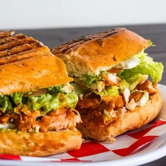 Pan artesanal de hierbas finas, 150 g de pechuga de pollo a la plancha con salsa Buffalo, queso panela, lechuga, aguacate, tomate y aderezo ranch. Un chorrito de aceite de oliva en spray y listo, ¡sabor sin culpa!