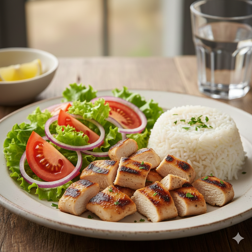 200 gramos de pollo a la parrilla, acompañado de ensalada de lechuga con tomate y arroz blanco. (La foto es ilustrativa)