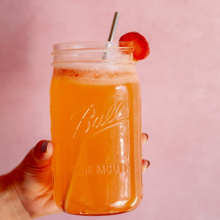 Con betabel, zanahoria y naranja. Preparado al momento, sin azúcar ni ingredientes añadidos.