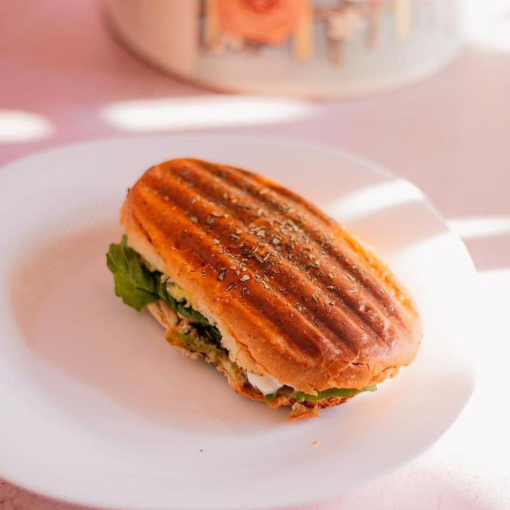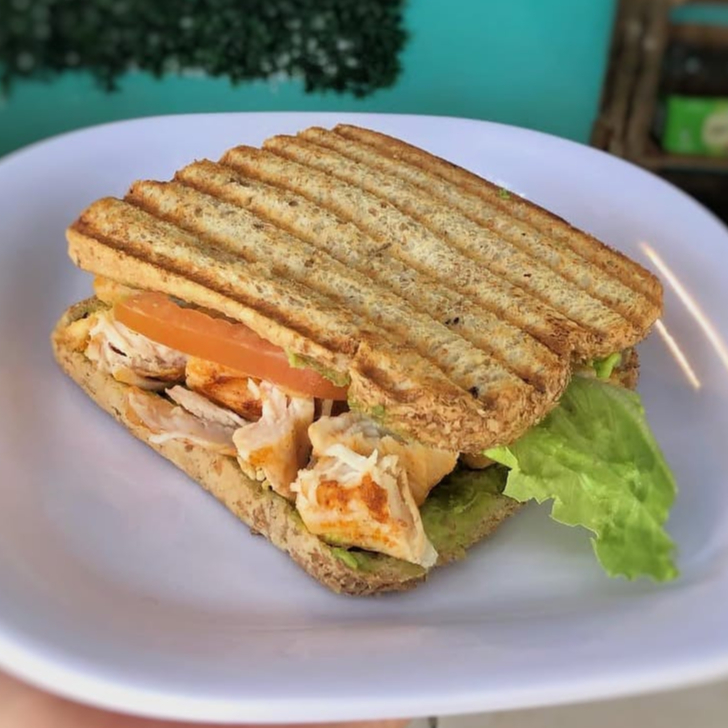 Panini mediano con jamon de pavo, preparado en pan artesanal de hierbas finas, queso panela, lechuga, aguacate, tomate y aderezo ranch.