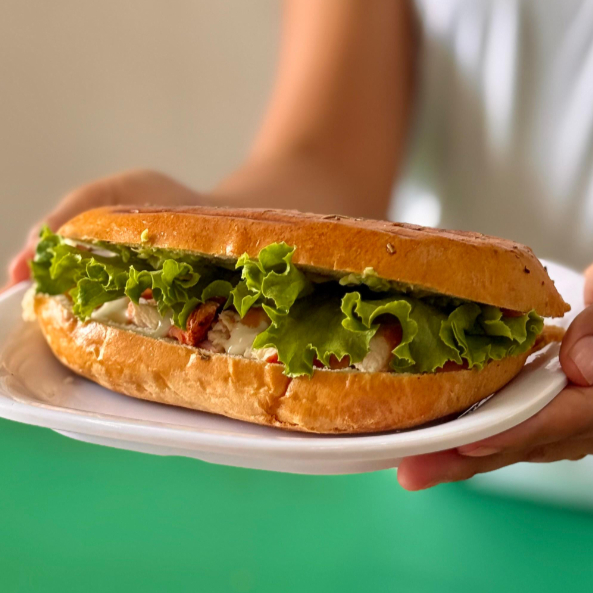 Elaborado en pan artesanal de hierbas finas con queso panela, lechuga, aguacate, tomate y aderezo ranch.