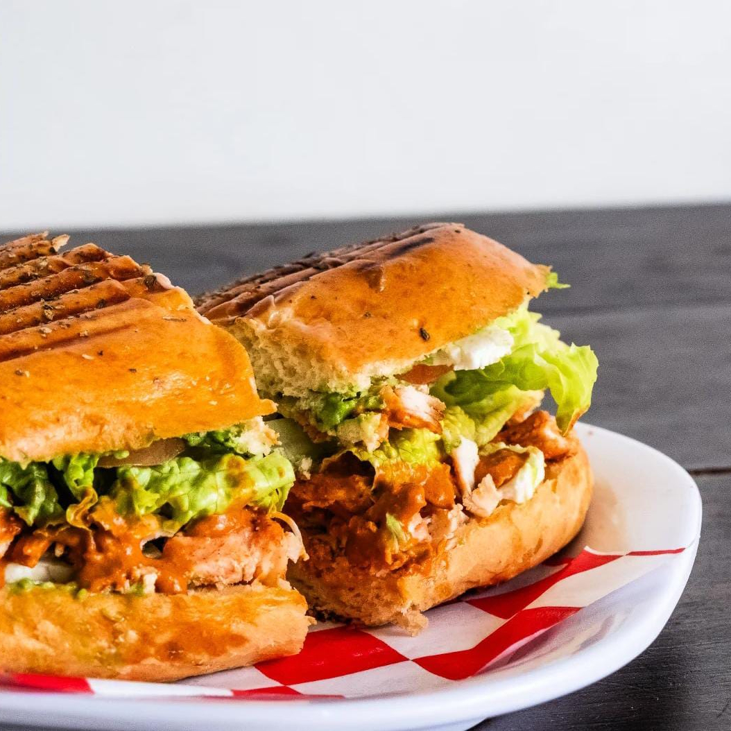 150 gr de 100% pechuga de pollo bañado en salsa buffalo, elaborado en pan artesanal de hierbas finas, queso panela, lechuga, aguacate, tomate y aderezo ranch. Preparado con una fina bruma de aceite en spray, logrando una preparación ligera y sin exceso de grasa.