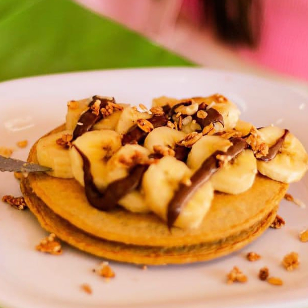 2 Pancakes de avena, acompañados de miel, fresa y plátano.