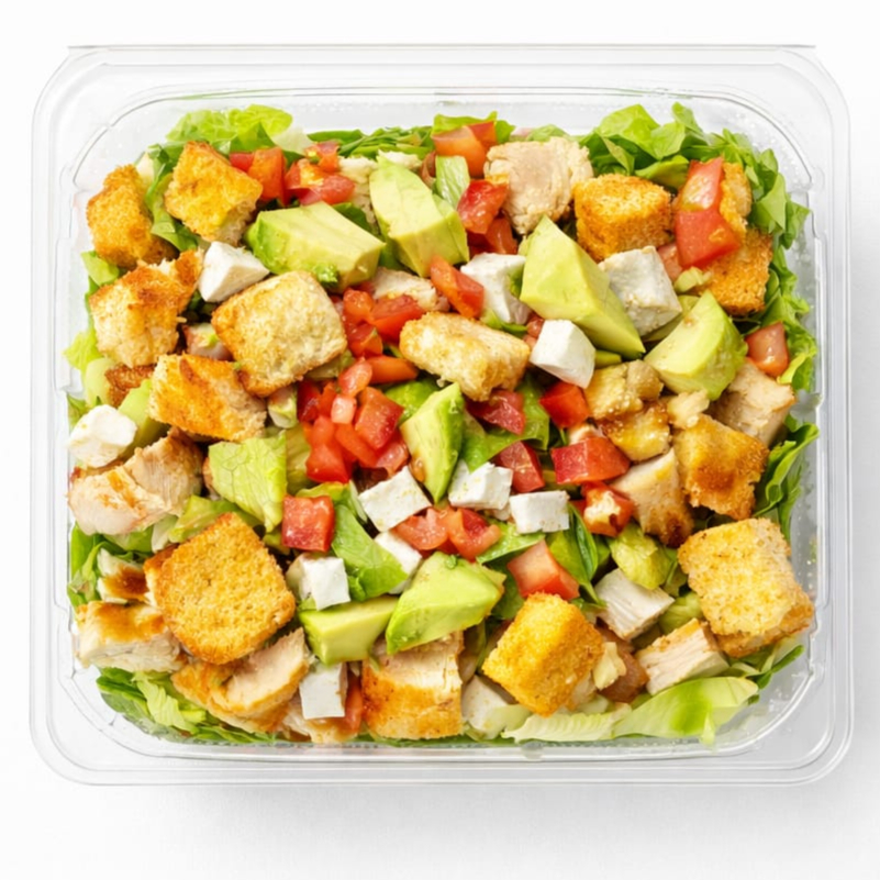 Deliciosa y ligera ensalada a base de lechuga con 100 g de pollo, queso panela, crutones, tomate, aguacate y aderezo ranch.