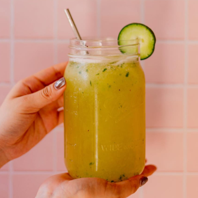 Con naranja, apio, espinaca, jengibre, nopal y pepino. Preparado al momento, sin azúcar ni ingredientes añadidos.