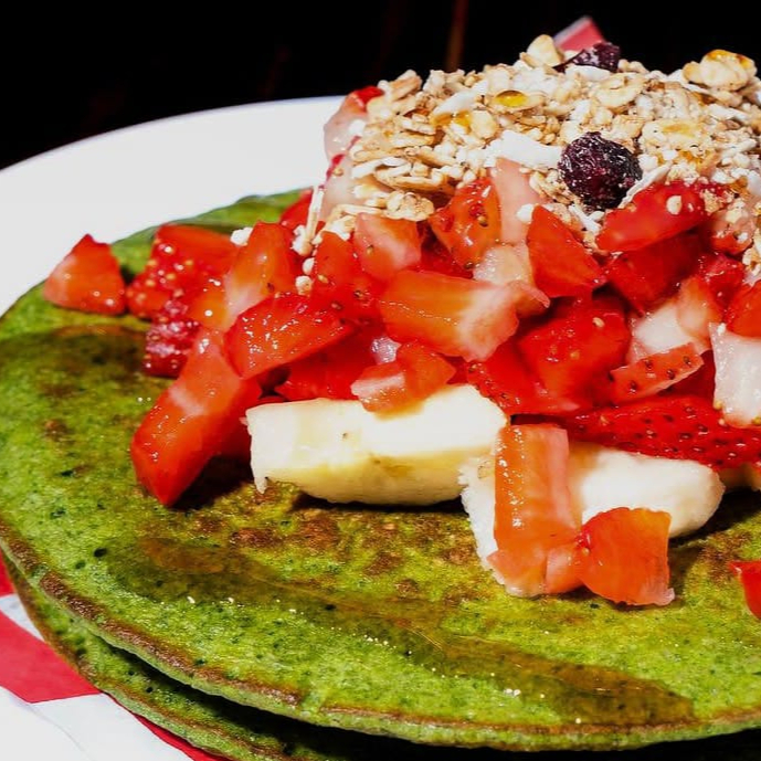 Pancakes de avena (2 piezas) con espinaca (dosis extra de proteína) con fruta y un toque de granola.