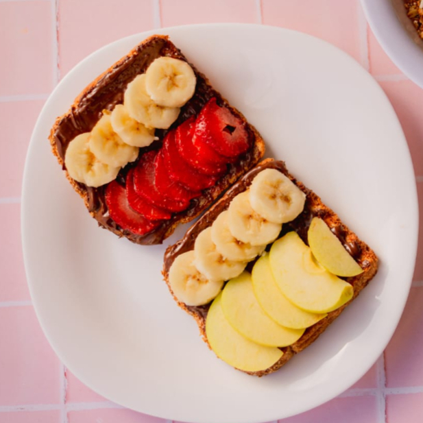 2 rebanadas de pan cero cero tostado, acompañado de fruta y tu elección de crema de avellana, crema de cacahuate o mermelada light