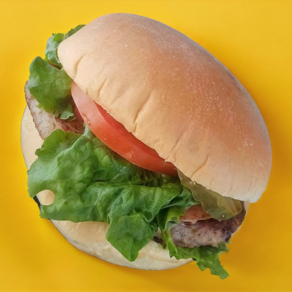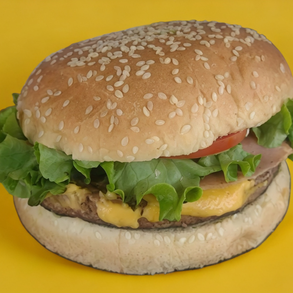 Pan con ajonjolí, carne de res 150gr acompañada de lechuga, tomate, queso tipo americano, jamón y mayonesa.