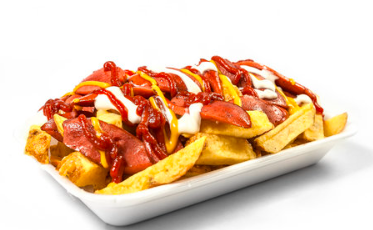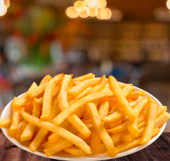 Papa a la francesa, acompañada con salchicha de pavo, queso liquido amarillo y cátsup.