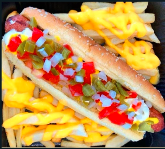 Salchicha de pavo tomate, cebolla chile, tomate, mayonesa, cátsup mostaza.