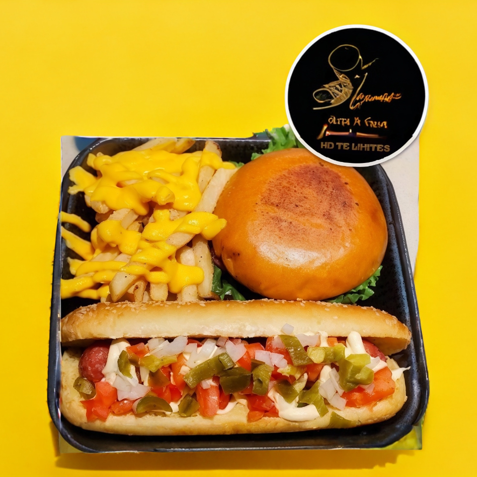 Paquetote con: 1 Hot Dog Grande, 1 Hot Dog Chico, 1 Hamburguesa Brioche con Papas Fritas.