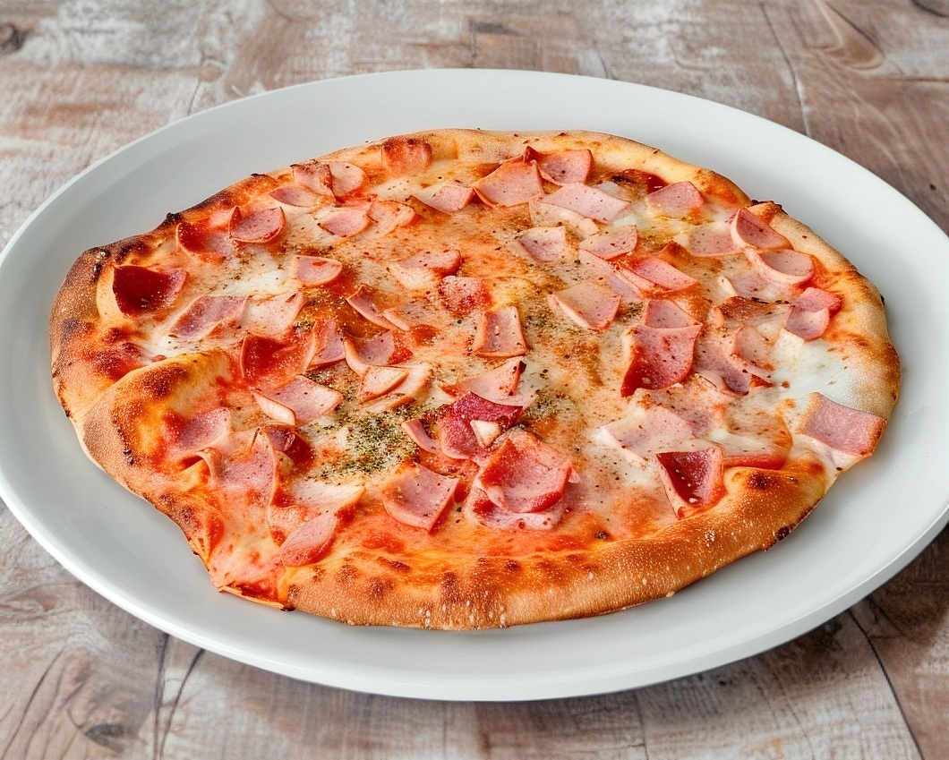 Pizza de jamón, pepperoni y salchicha italiana grande 35 cm de 8 rebanadas.