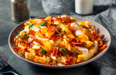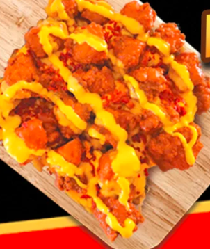 Papas preparadas de boneless con salsa a elegir, queso amarillo y tocino seco.