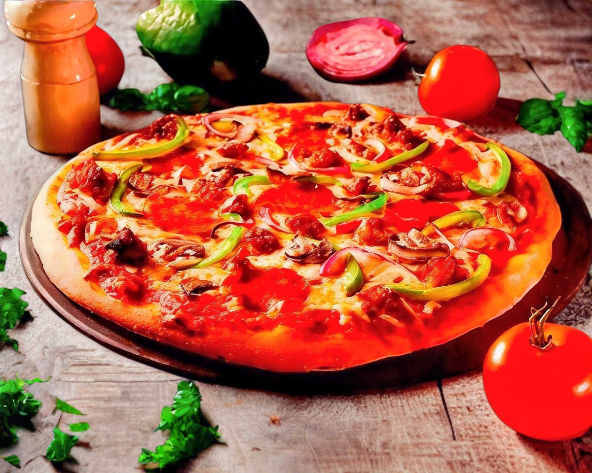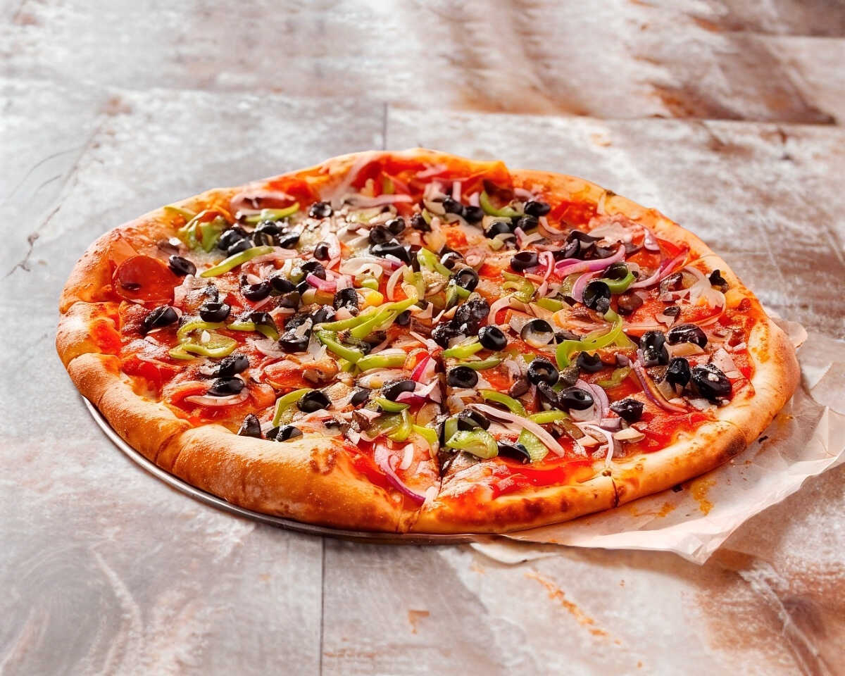 Pizza con pepperoni, jamón, salchicha italiana, pimiento morrón, cebolla y champiñones.