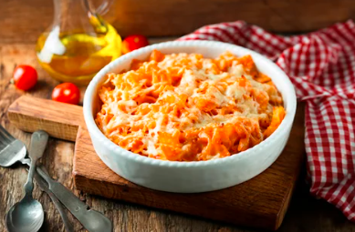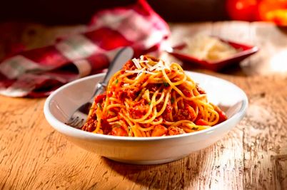 Orden de espagueti 350 g con tomate, queso mozzarella derretido y carne.