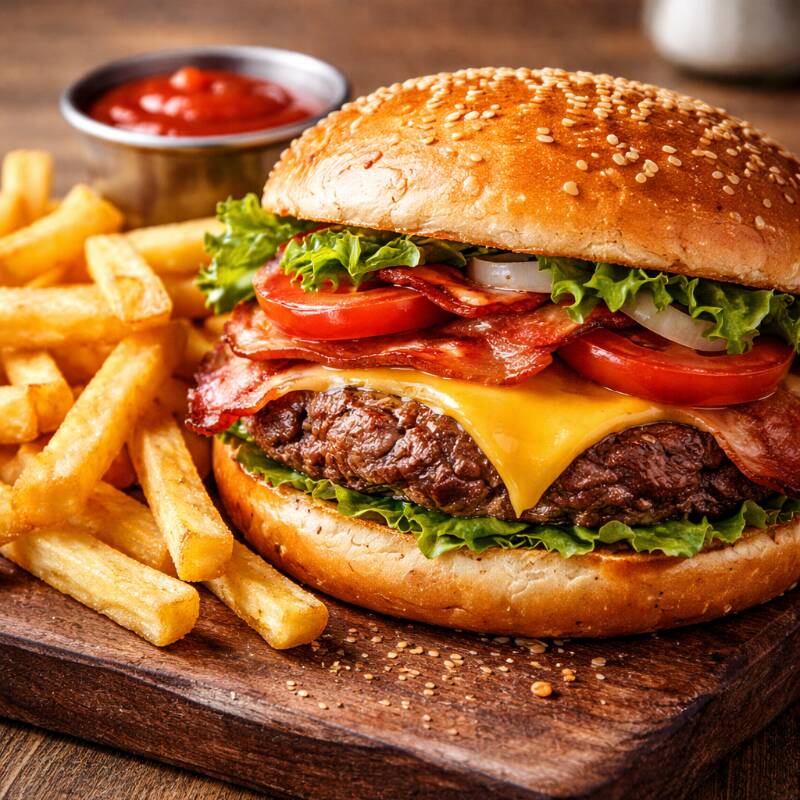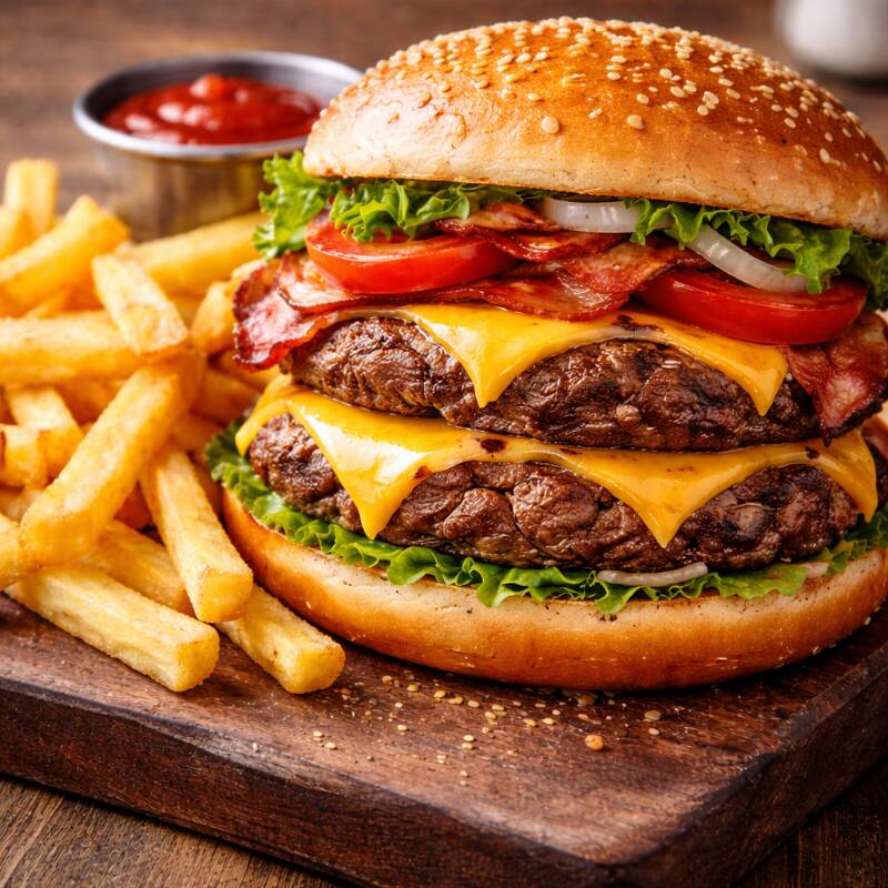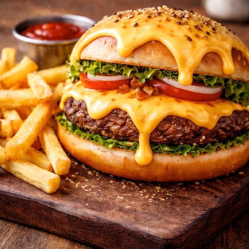 carne de res bien dorada a la parrilla, con queso derretido entre cada capa, servida en un pan suave y tostado. Acompañada de lechuga fresca, jitomate y un toque de aderezos clásicos que hacen cada mordida irresistible.