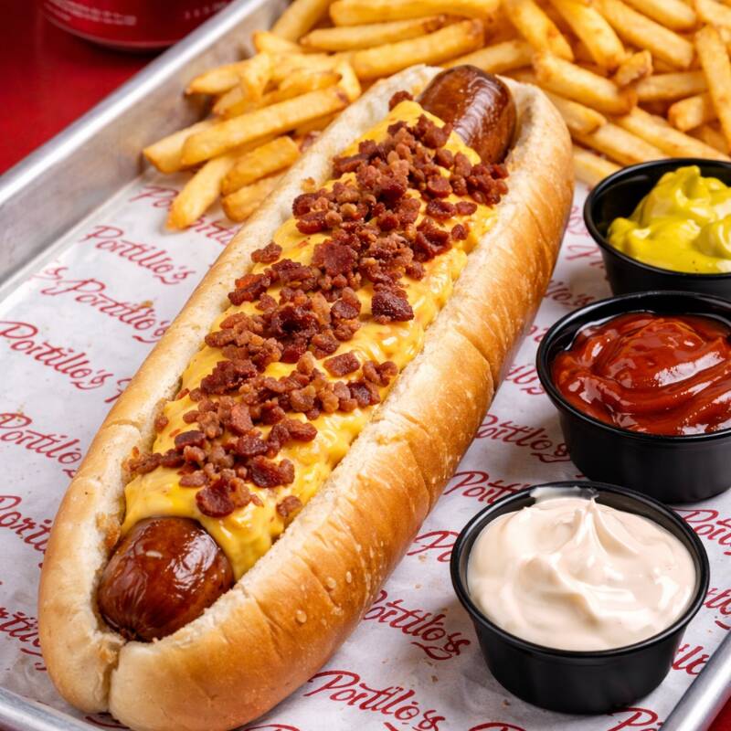 Salchicha bien dorada dentro de un salchichón envueltos en tocino servida en un pan suave y calientito, acompañada de jitomate, cebolla, mostaza, catsup y mayonesa. Un clásico callejero, simple pero lleno de sabor en cada mordida