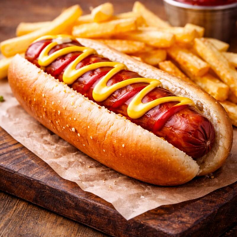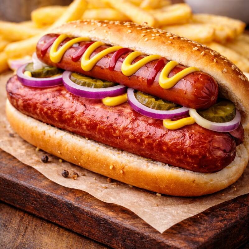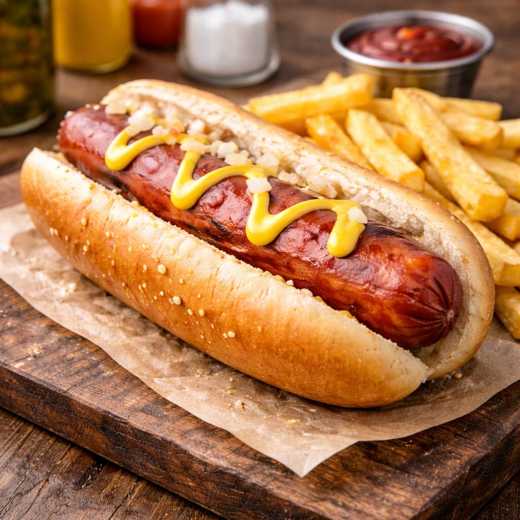 Salchichón bien dorada servida en un pan suave y calientito, acompañada de jitomate, cebolla, mostaza, catsup y mayonesa. Un clásico callejero, simple pero lleno de sabor en cada mordida