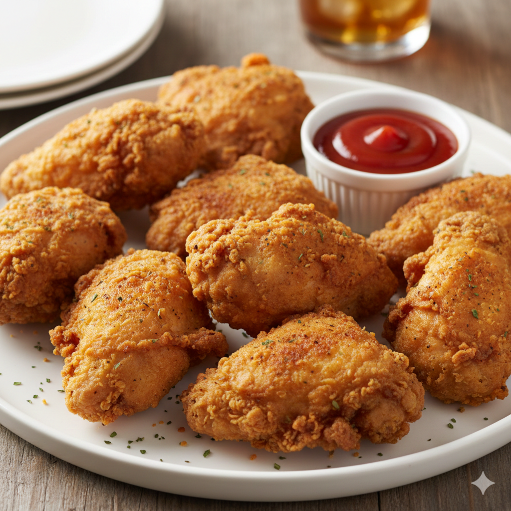 8 deliciosas piezas de pollo, acompañadas de catsup. Es una promoción a un precio especial, no incluye los demás complementos, solo las ocho piezas de pollo.