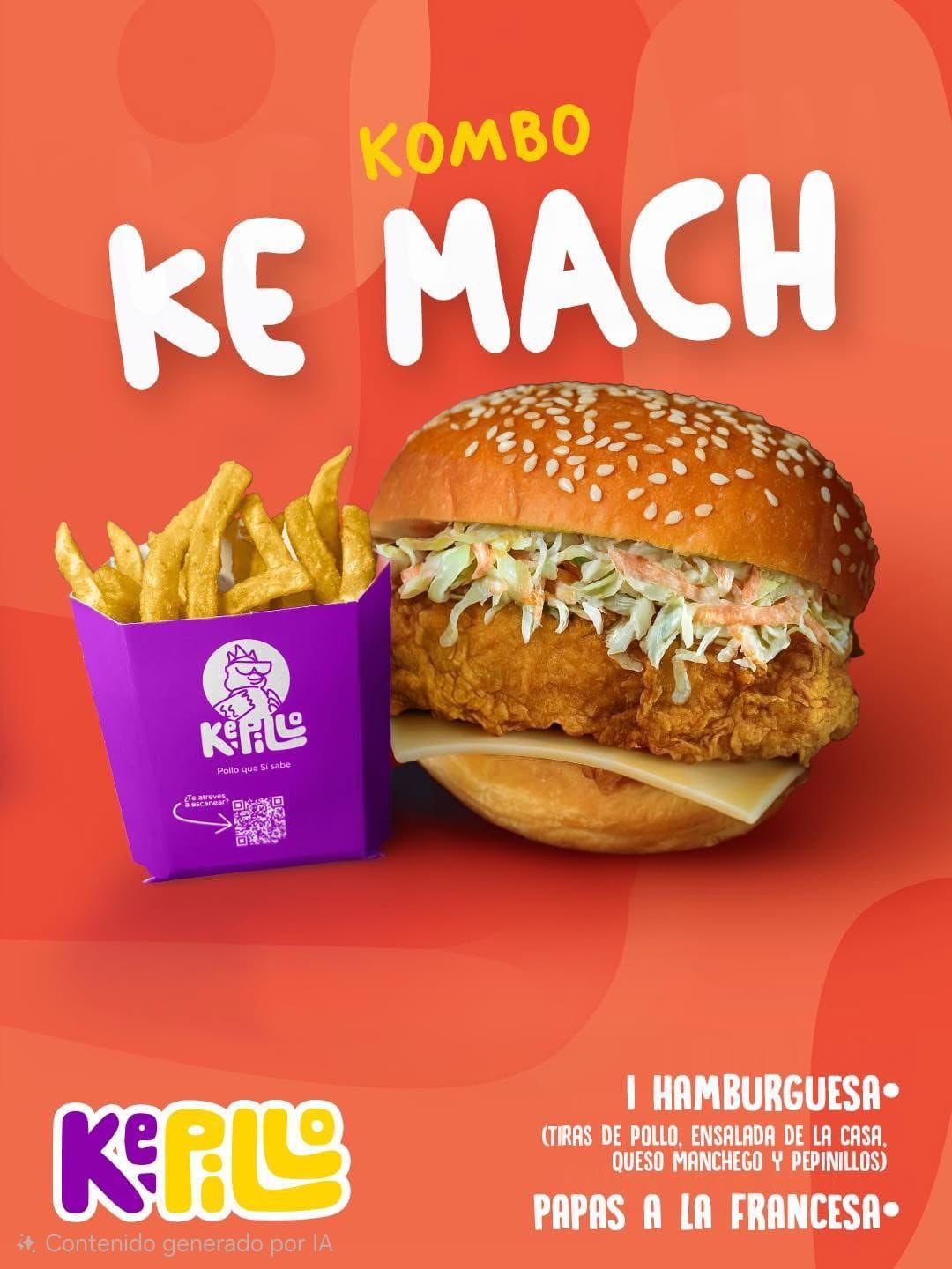 1 Hamburguesa con Tiras de pollo, ensalada de la casa, queso manchego, pepinillos y papas a la francesa.