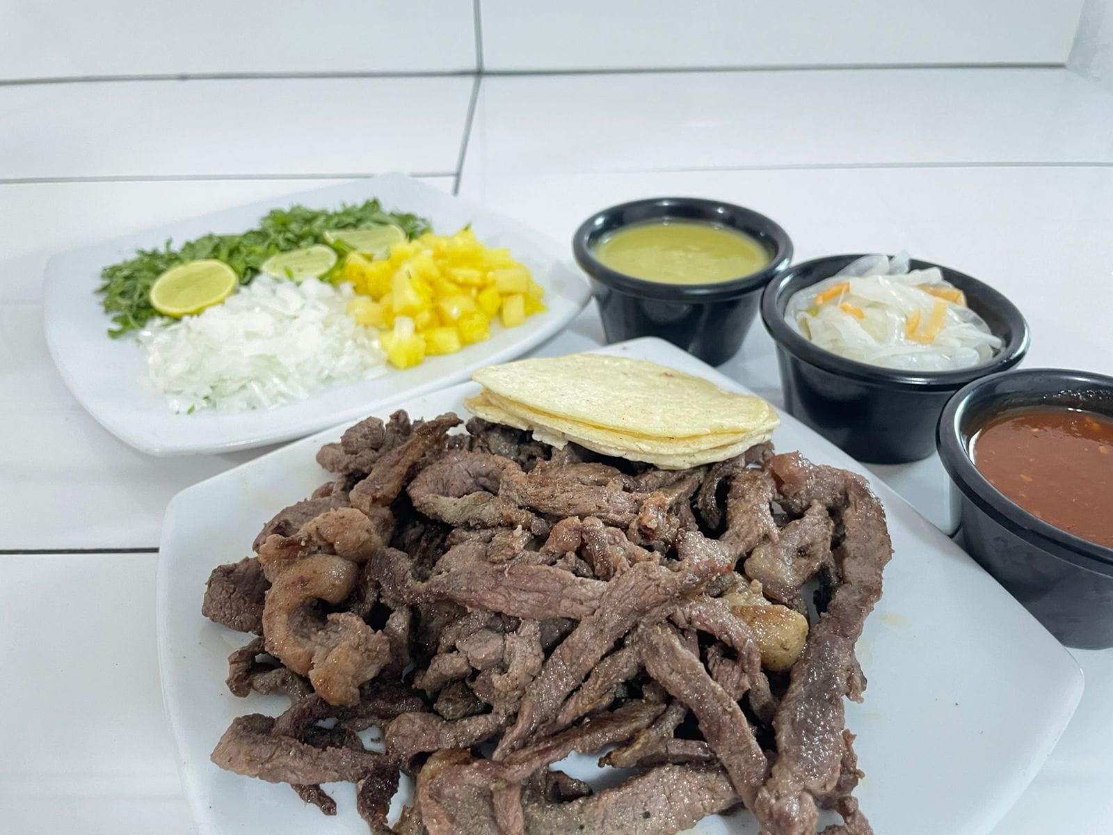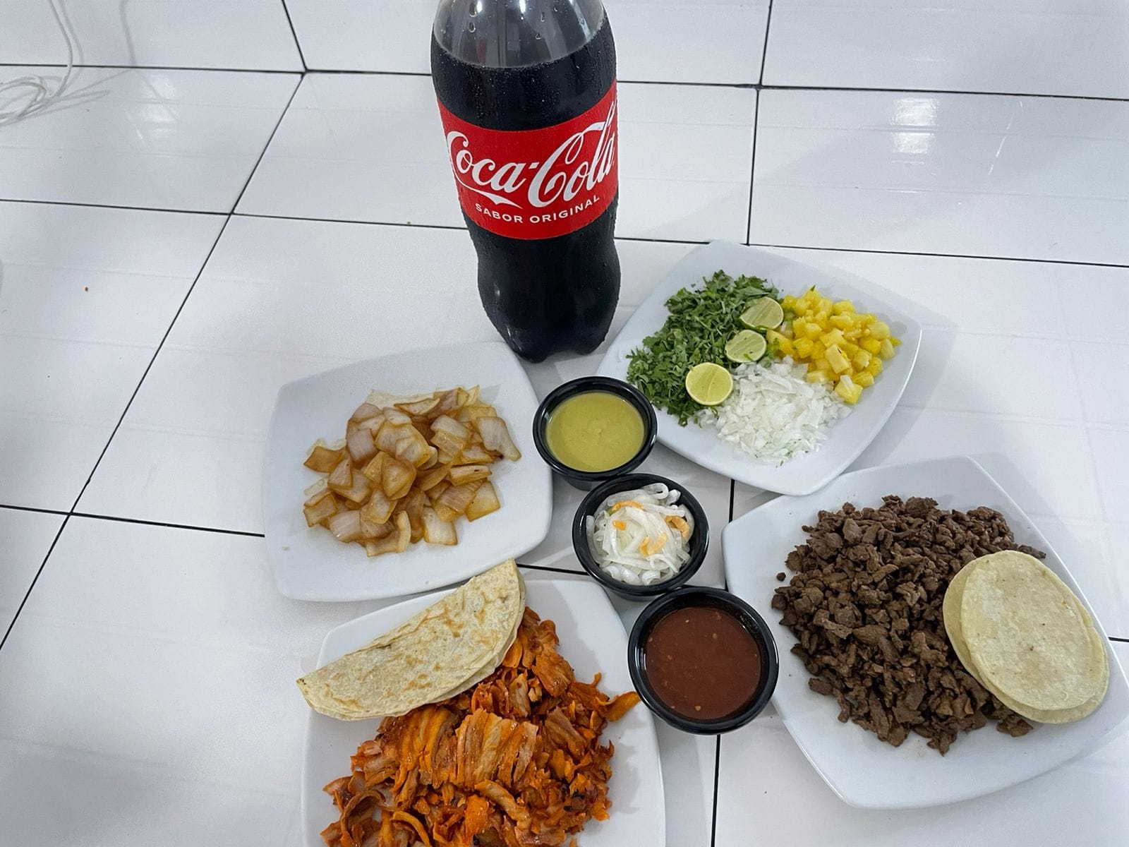 1 Kg de Bistec, 1 órden de cebollas asadas, 1 Coca Cola de 1 Litro, 1 quesadilla extra grande, 30 tortillas de maíz, salsas y verduras.