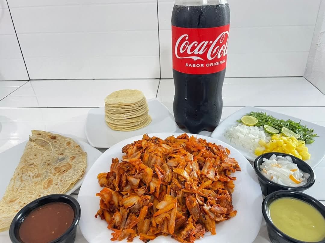 1/2 Kg de Trompo, 1/2 de Bistec, 1 órden de cebollas asadas, 1 Coca Cola de 1 Litro, 1 quesadilla extra grande, 30 tortillas de maíz, salsas y verduras.