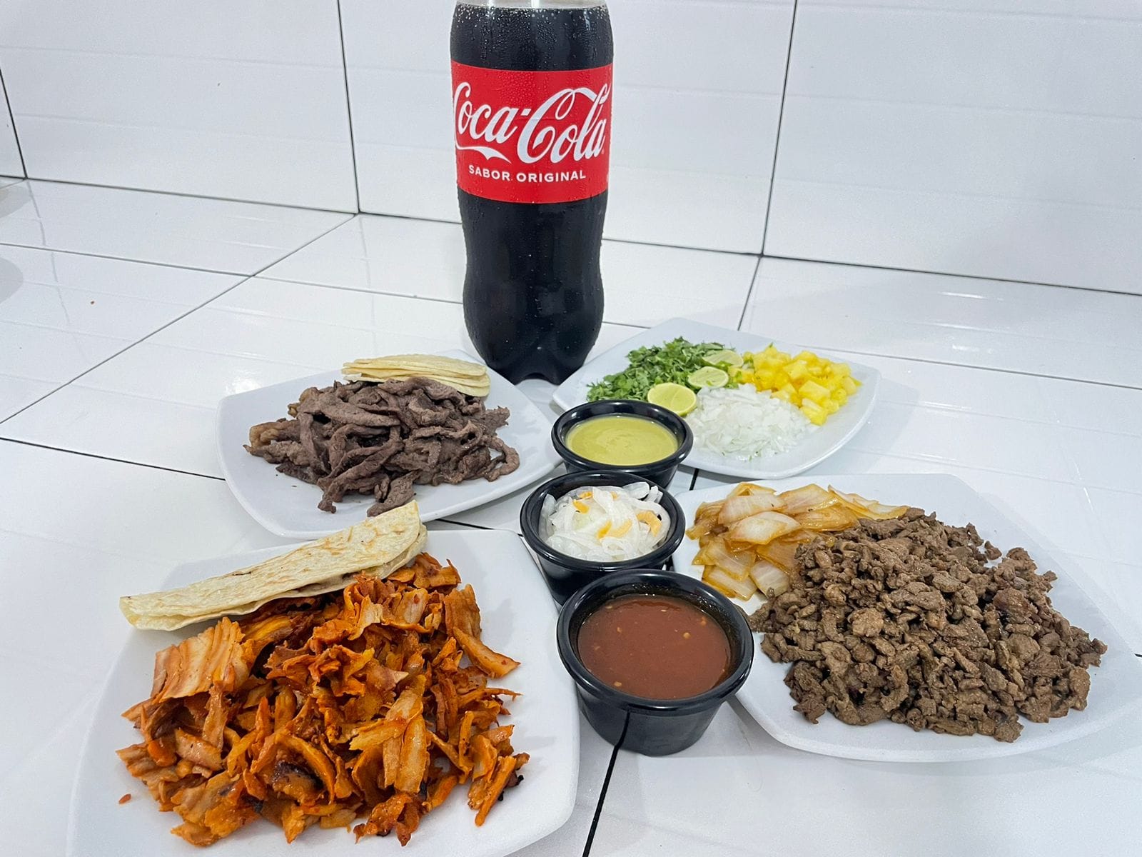 1/2 de Trompo, 1/2 de Bistec, 1/2 de Carne Asada 1 órden de cebollas asadas, 1 Coca Cola de 2 Litros, 1 quesadilla extra grande, 30 tortillas de maíz, salsas y verduras.