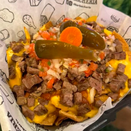 Totopos, queso amarillo, fajita americana, chilli, pico de gallo y jalapeños.