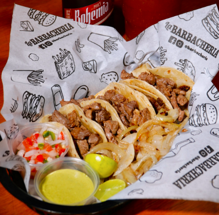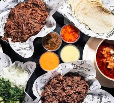 1/4 de deliciosa barbacóa que puedes elegir a tu gusto, ya sea natural o adobada, viene acompañda de cilantro, cebolla, limones, tortillas y salsitas.
