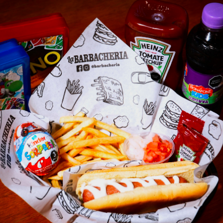 Pan brioche de mantequilla, salchicha de pavo, tomate, cremas, con papas fritas, incluye huevito kinder y jugo infantil frutal.