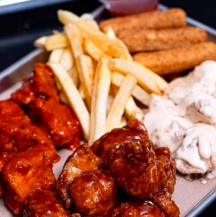 80 Boneless, 8 salsas, 5 ranch, 1 papas fritas, 3 elotes sazonados, 6 dedos de queso, 1 papas gajo.