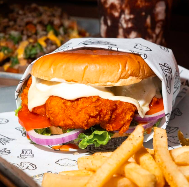 Pechuga ligeramente empanizada, bañada en salsa bufalo o la que tu prefieras, tomate, lechuga romana, cebolla morada, queso manchego y aderezo ranch.