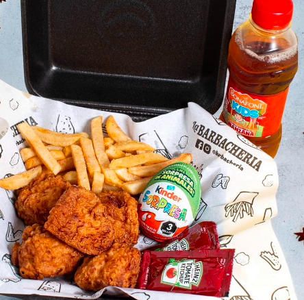 5 Boneless naturales 100% pechuga de pollo, papas fritas, huevito kinder sorpresa y jugo infantil frutal.