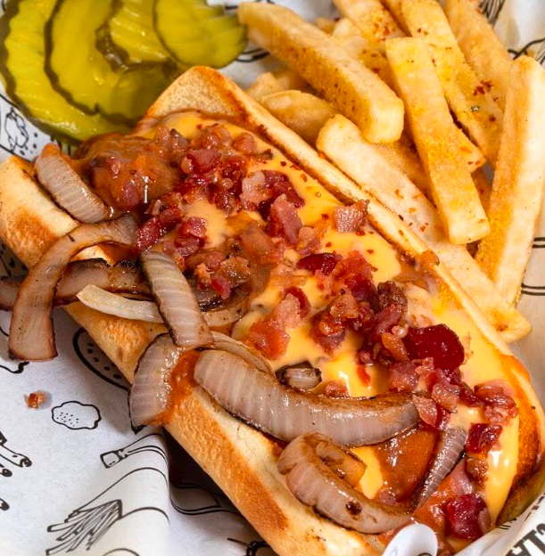 Pan brioche, queso amarillo, chili, cebolla asada, tocino y pepinillos.