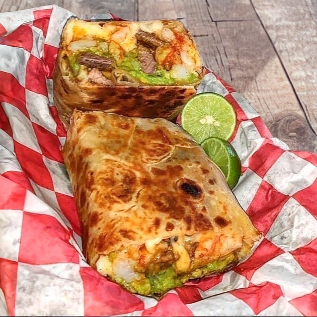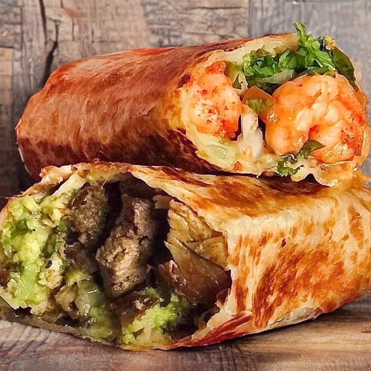 Delicioso Camarón salteado con morrón, cebolla y arrachera, queso gratinado, guacamole, repollo, pico de gallo y aderezo chipotle.
