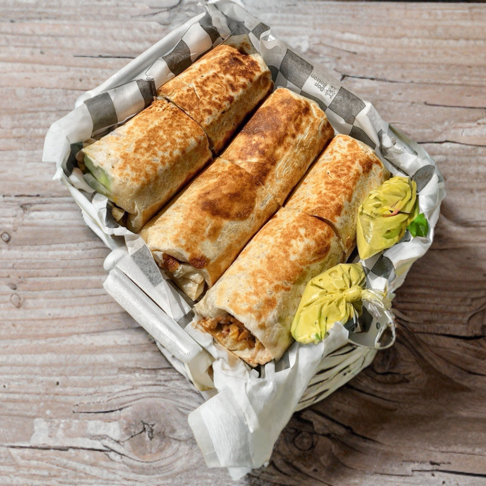 1 burrito de arrachera, guacamole, pico de gallo, queso gratinado, cebolla cocida