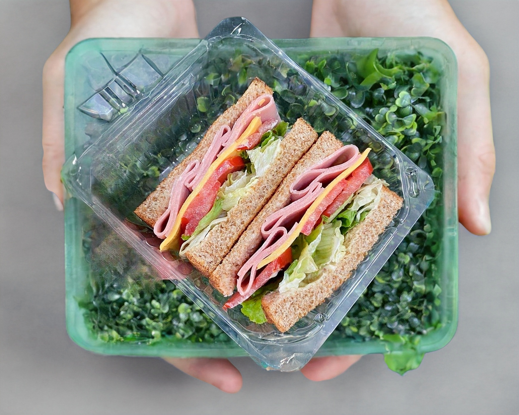 Sandwich con jamon de pavo, queso americano, queso manchego, tomate, lechuga, mostaza y aderezo de la casa