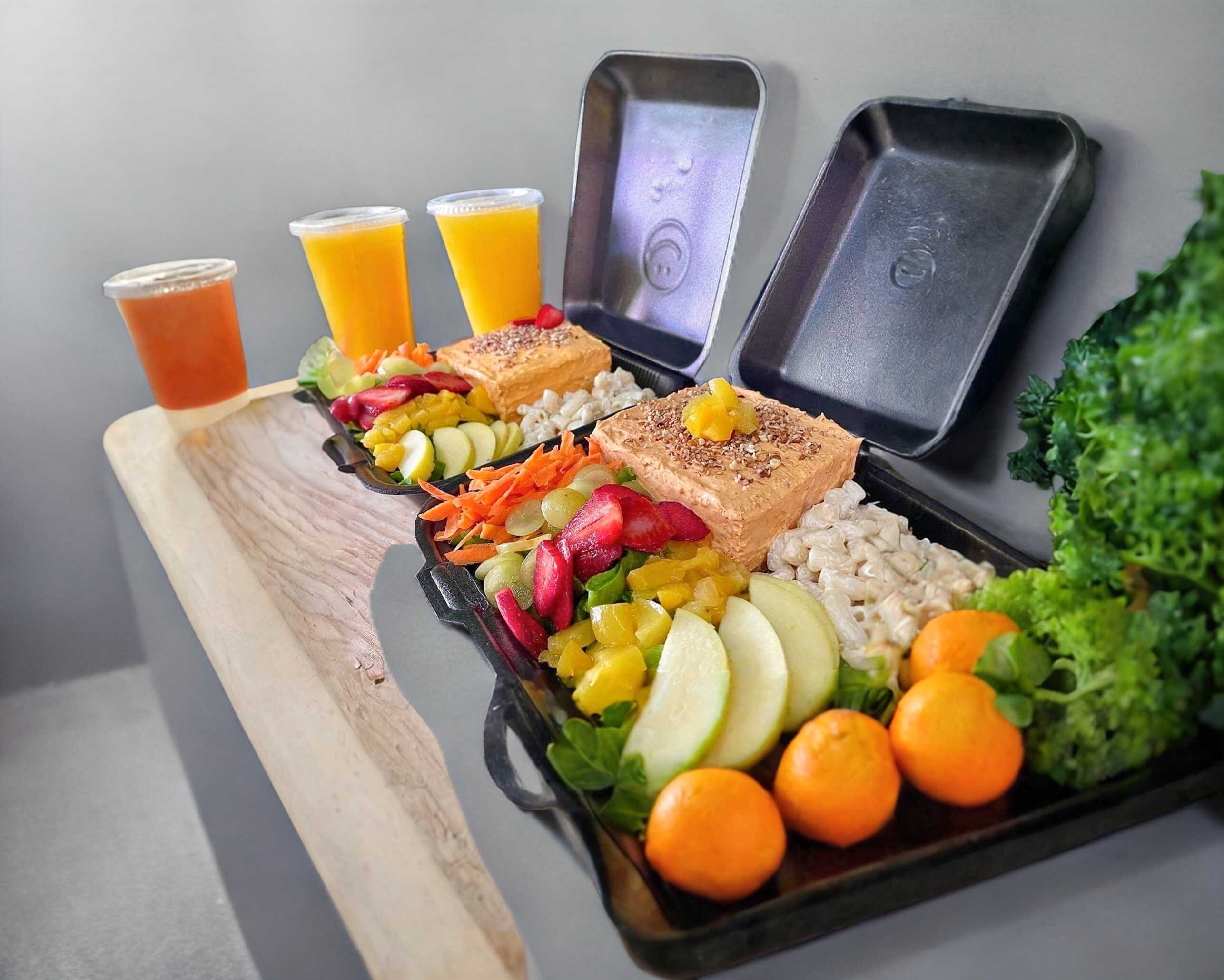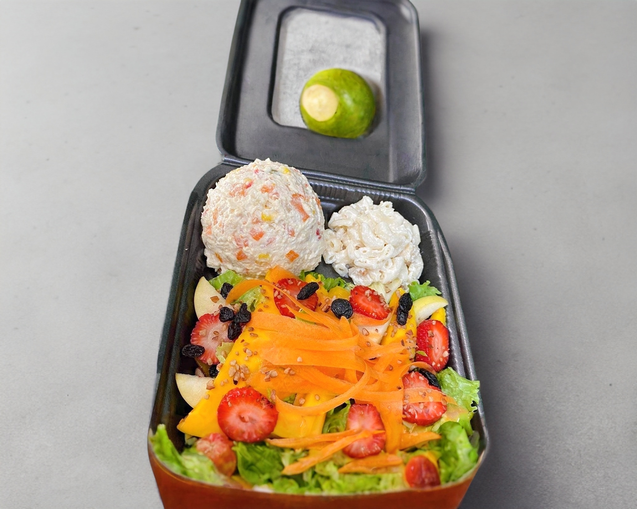 250g de ensalada de pollo, coditos, ensalada verde con mango, fresas, manzana, durazno, pasas y nuez. Acompañada de galletas saladas y jalapeños.