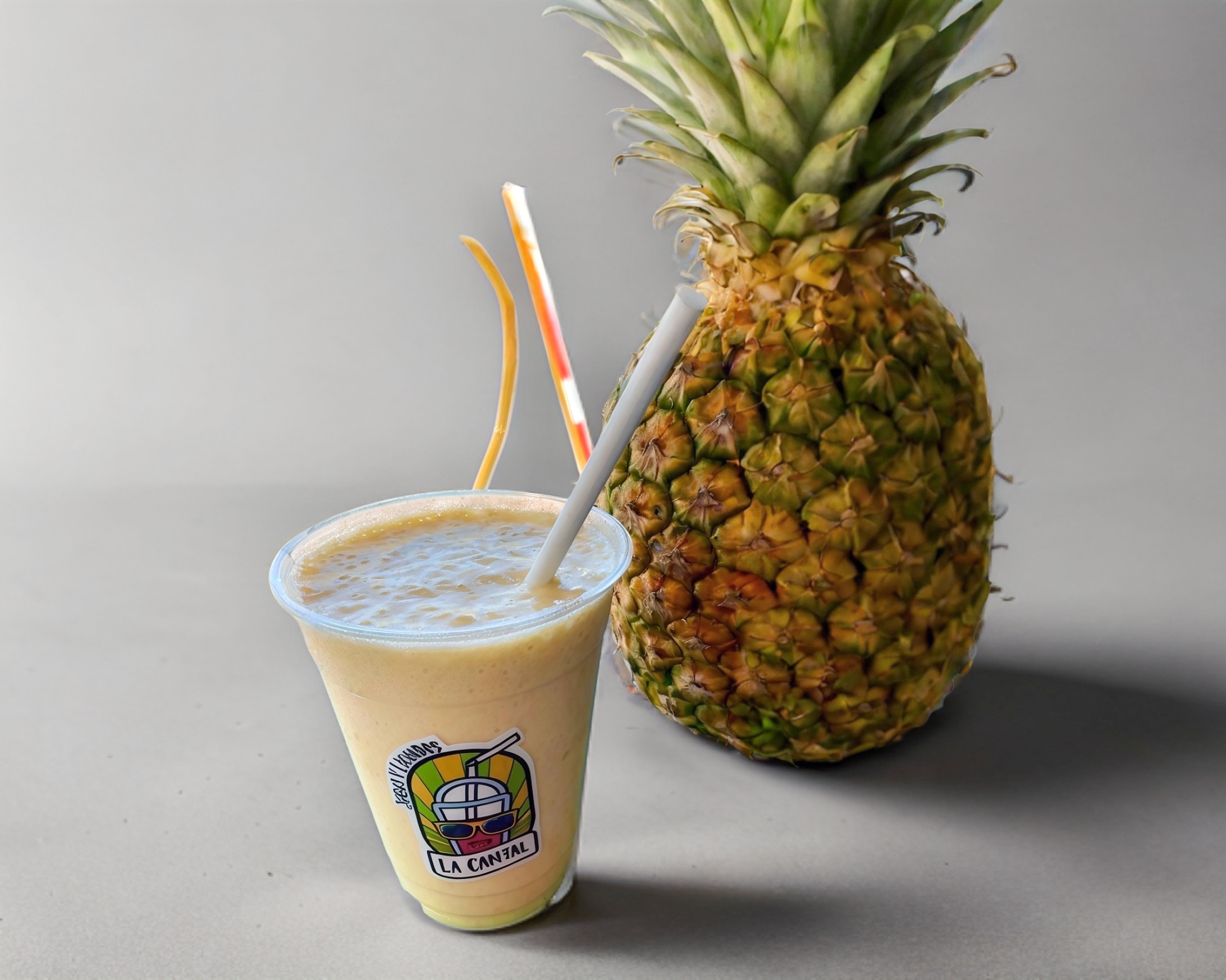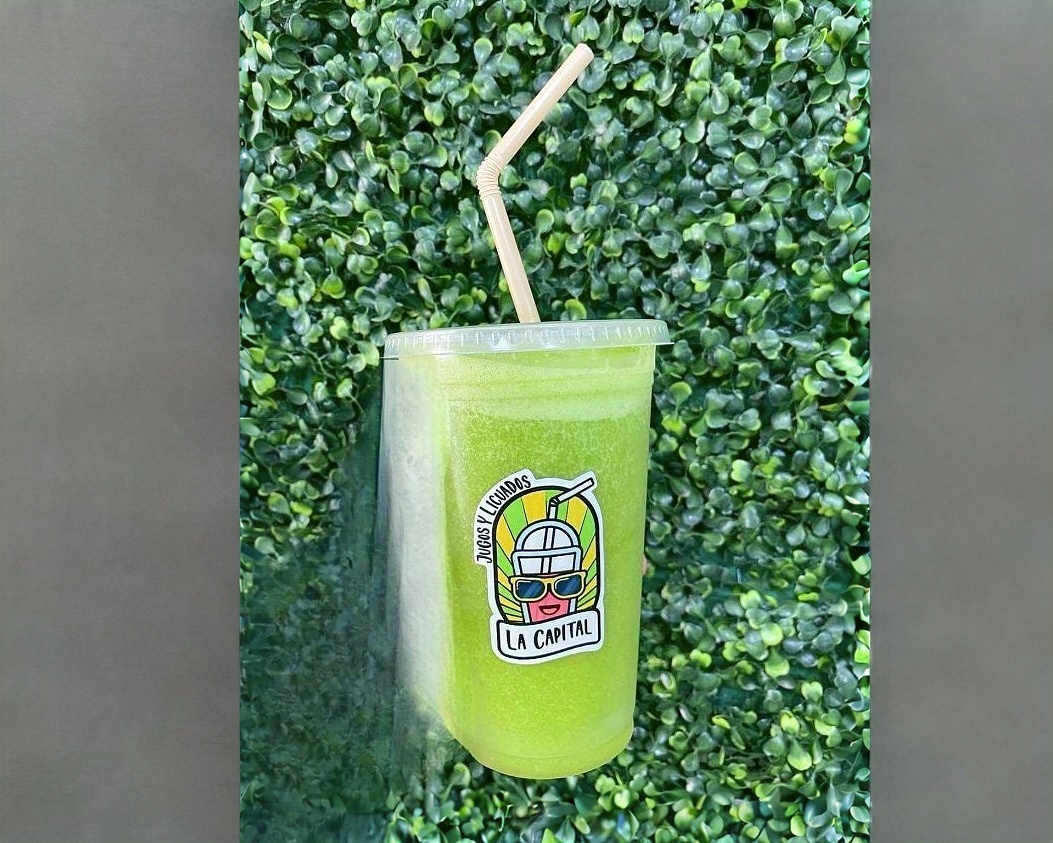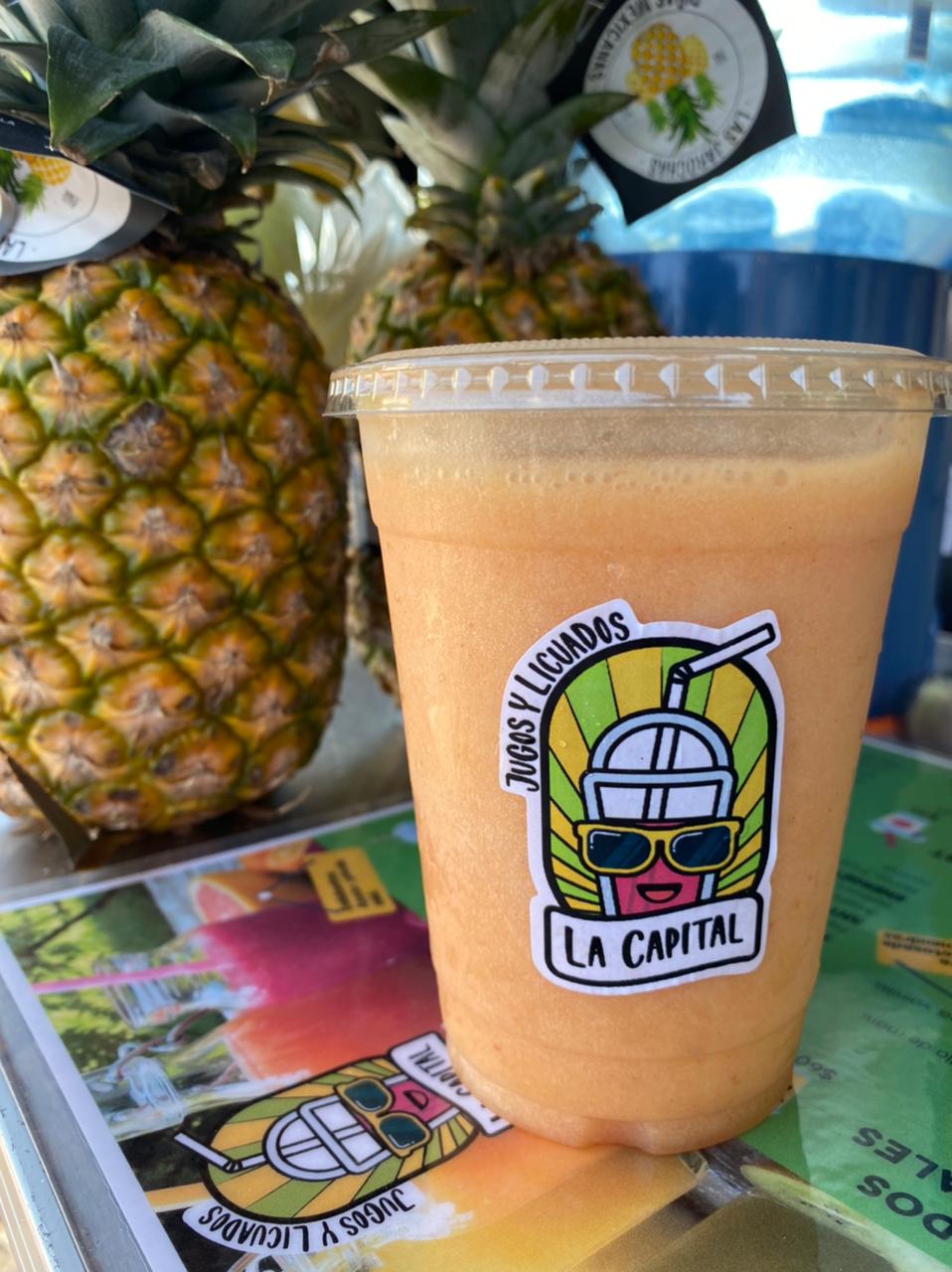 1/2 litro de jugo hecho con piña, apio, pepino, nopal, naranja, espinacas y avena