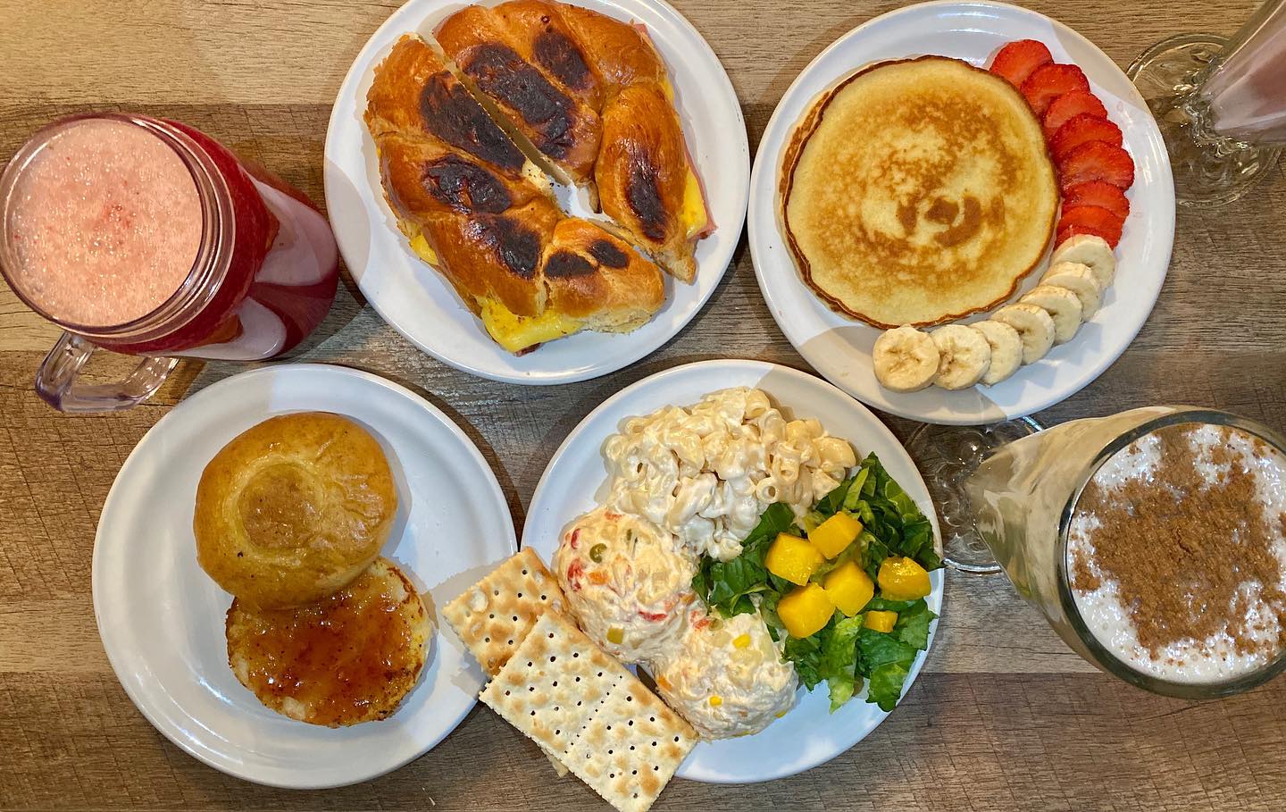 Acompañado de coditos y ensalada verde con fresas, uvas, zanahoria rallada, durazno y manzana