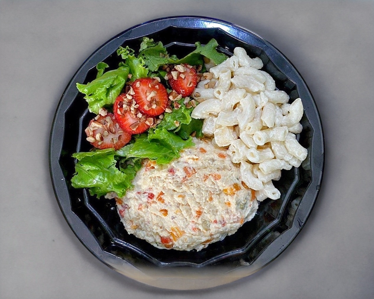 DELICIOSA ENSALADA DE PECHUGA, ACOMPAÑADA DE CODITOS, ENSALADA VERDE Y GALLETAS SALADAS