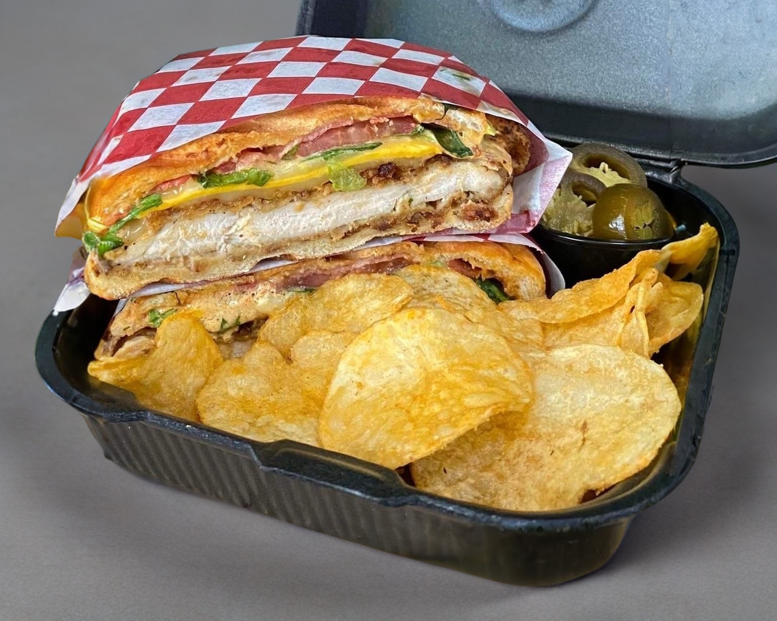 Pechuga de pollo crujiente, tocino, queso americano, queso manchego, tomate, lechuga y aderezo chipotle, y bolsa de papitas