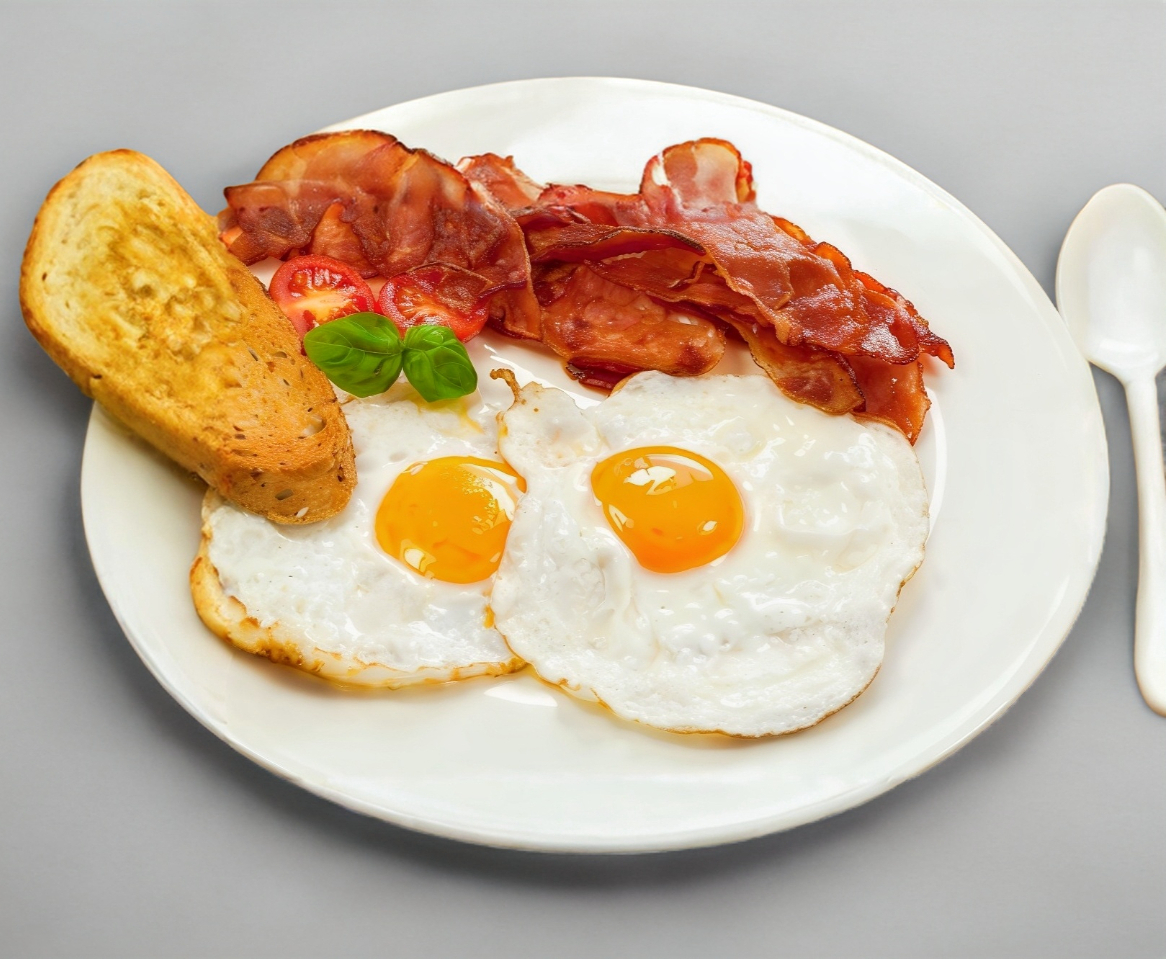 Huevos estrellados, montados en tostada, bañados con salsa cremosa.