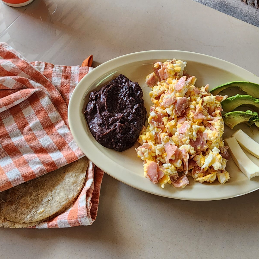 2 huevos revueltos con jamón acompañado de frijoles, queso, aguacate y tortillas recién hechas.
