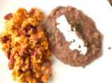 2 huevos revueltos con chorizo acompañados de frijoles, queso, aguacate y tortillas recién hechas.