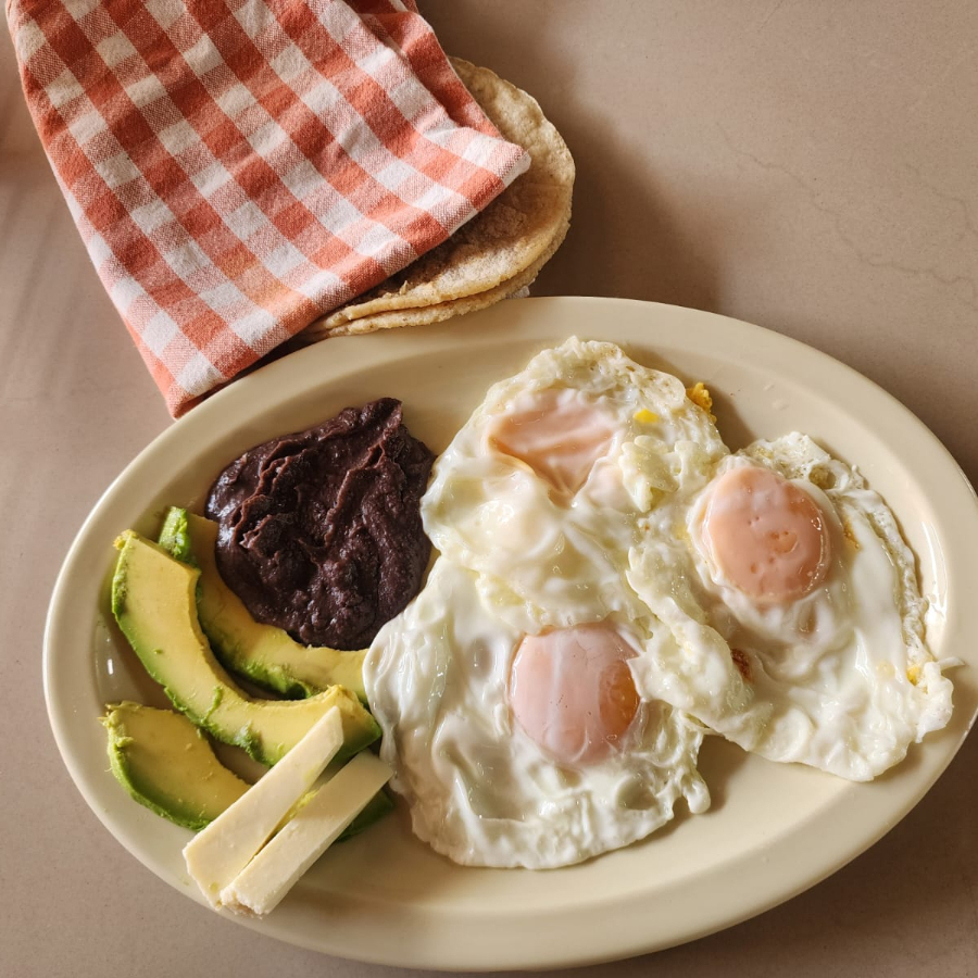 2 huevos estrellados, acompañados de frijoles, queso, aguacate y tortillas recién hechas.