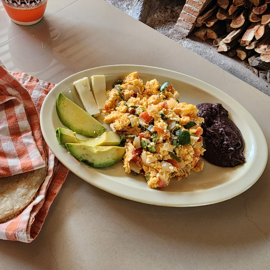 2 huevos revueltos a la mexicana acompañado de frijoles,queso, aguacate y tortillas recién hechas.