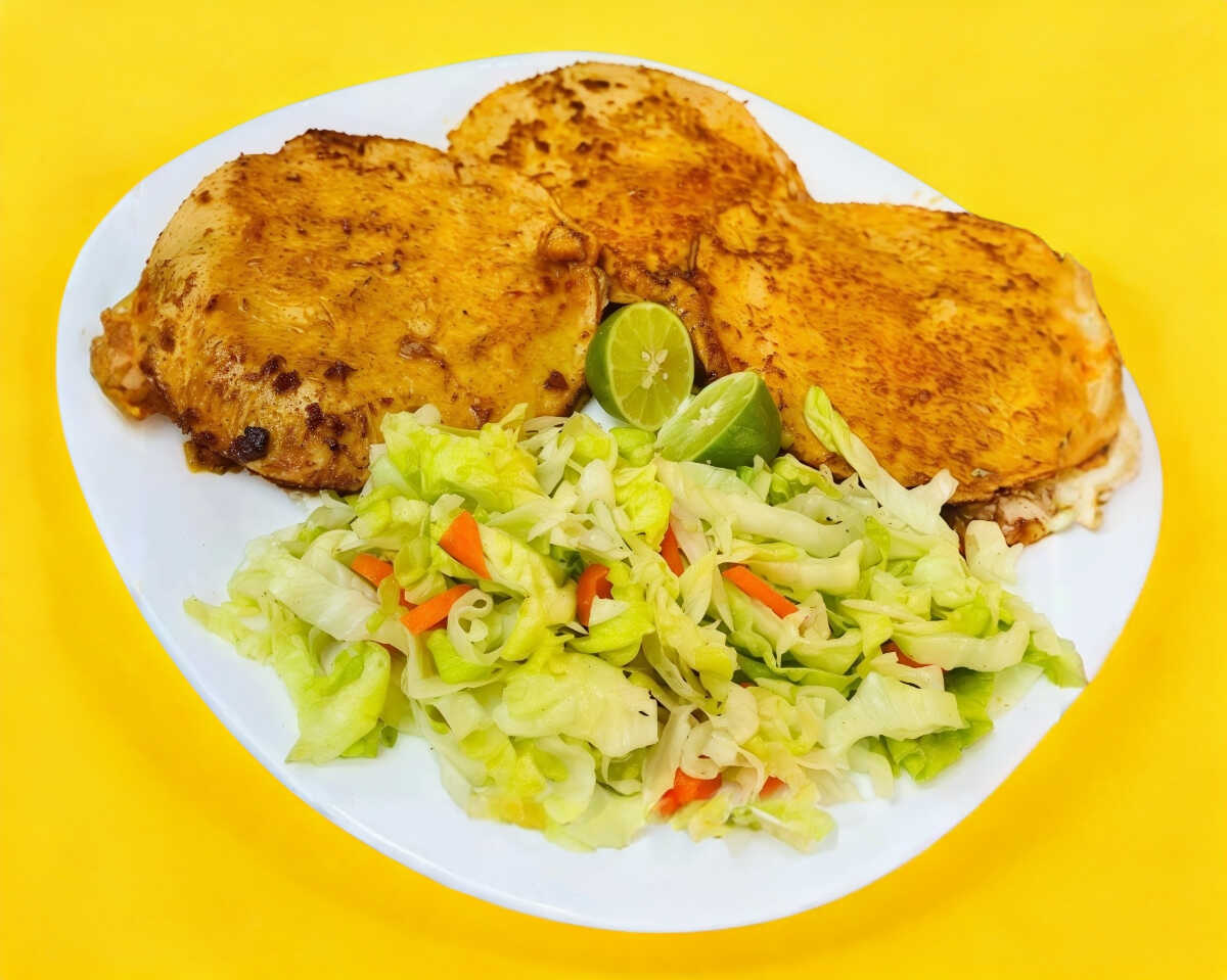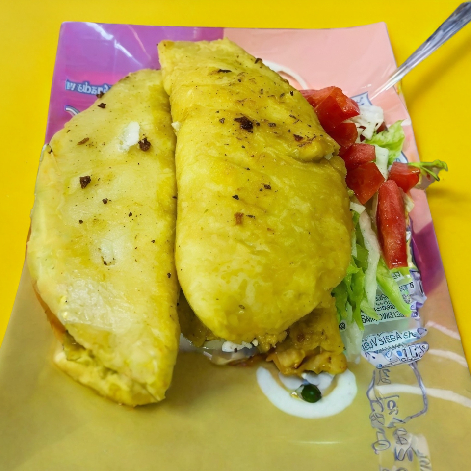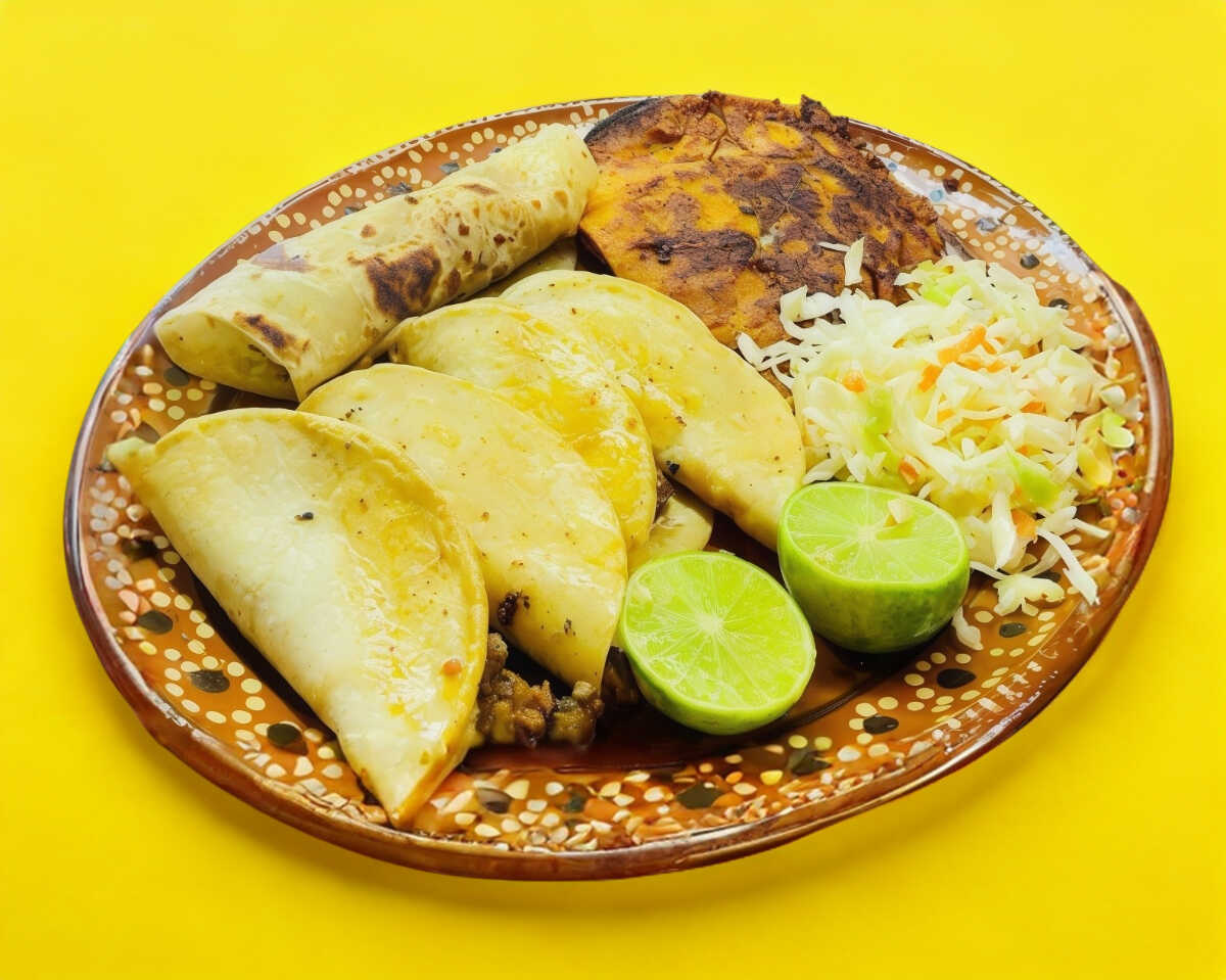 3 Quesadillas fritas rellenas de discada y queso derretido. incluye ensalada de lechuga, salsa y limon