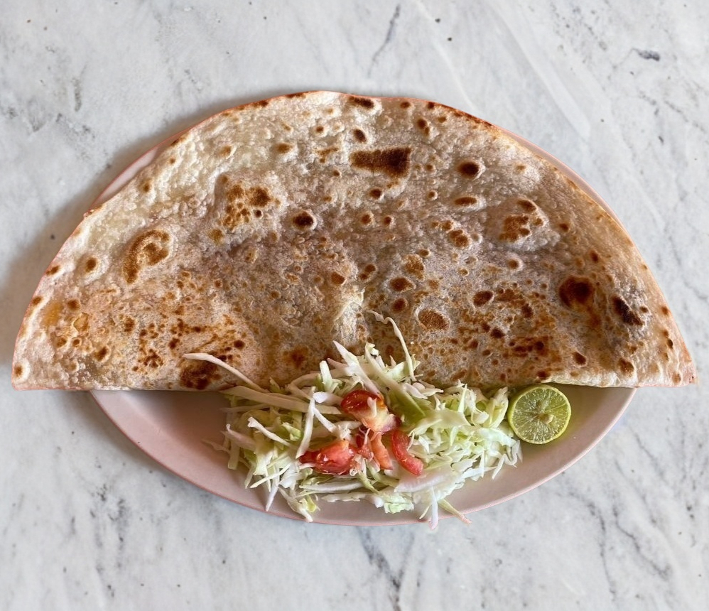 Quesadilla de harina con guiso, tamaño 33 cm aproximadamente.